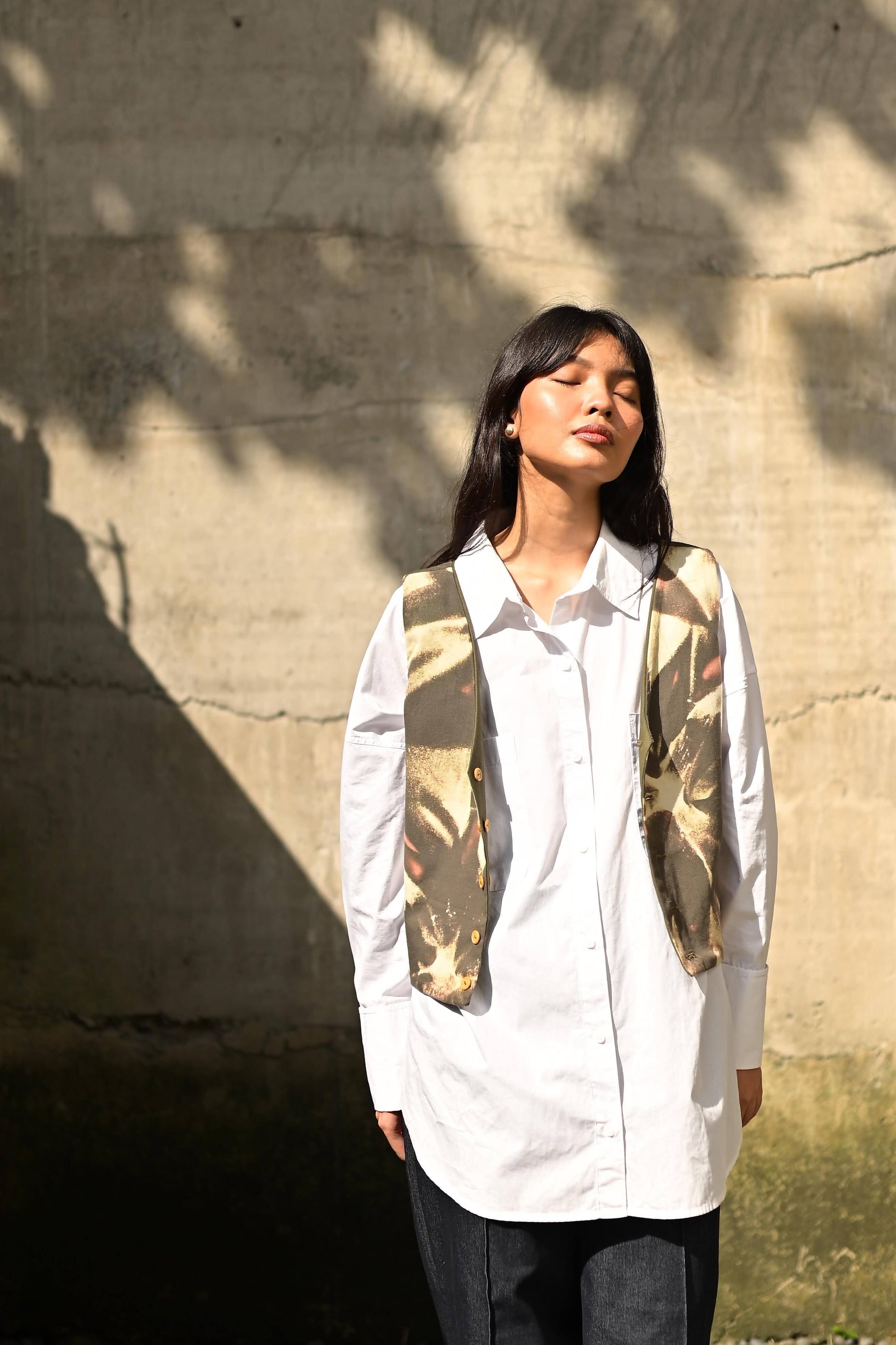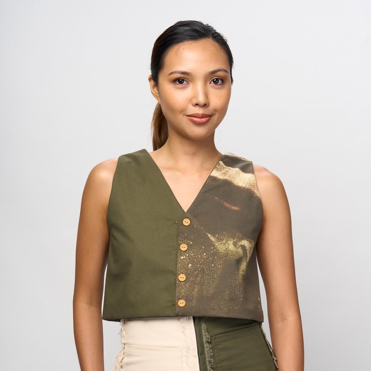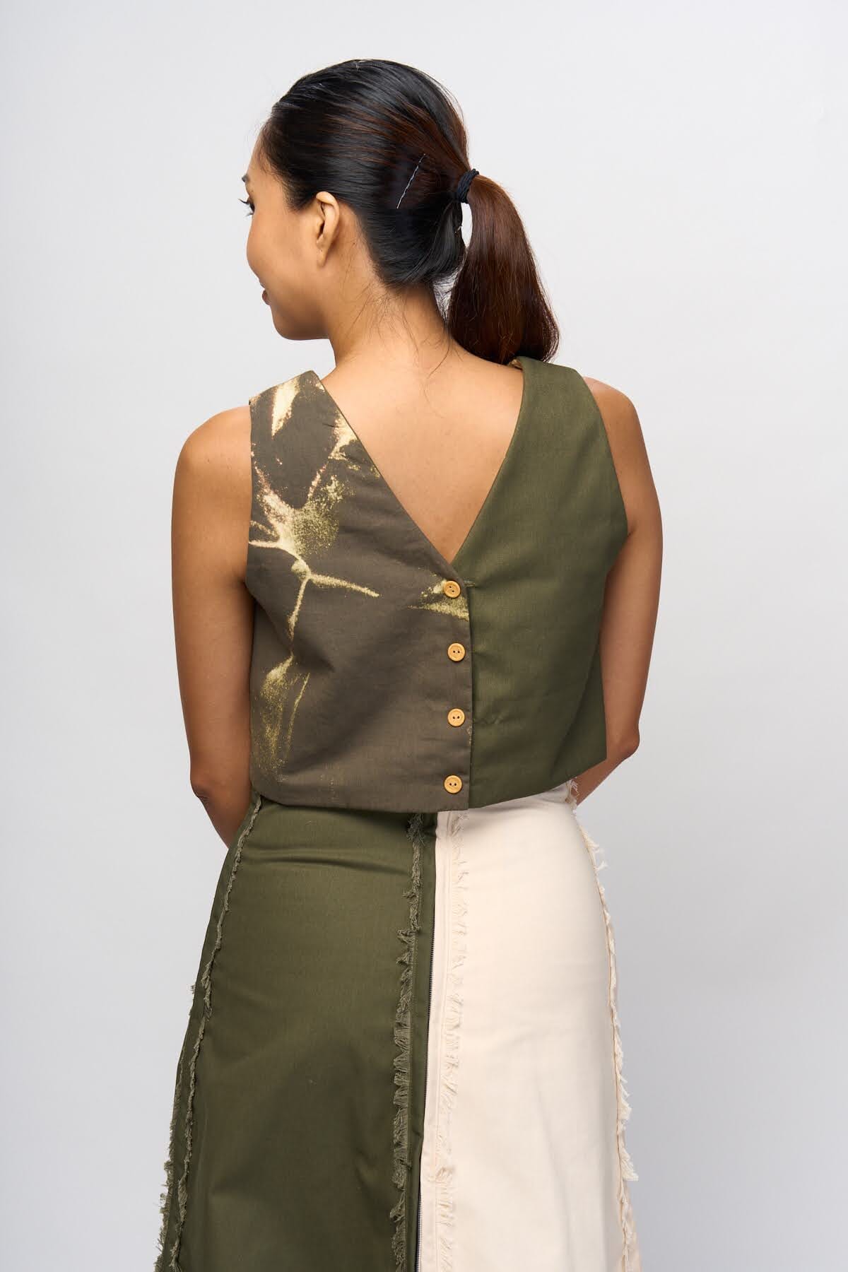 • Sleeveless shirt with V-neck with buttons on the front and back that allow it to be worn in multiple ways